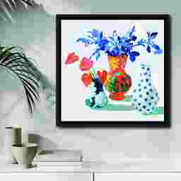 To achieve a contemporary aesthetic, look for pieces that utilize a bold, square orientation and a minimalist frame. This artwork features a modern interpretation of a floral subject, enhanced by a custom black frame that provides a crisp, clean border. Unlike traditional unframed or ornate gold-framed florals, this combination of multi-color canvas and sleek black framing is specifically designed to complement minimalist or transitional interiors.