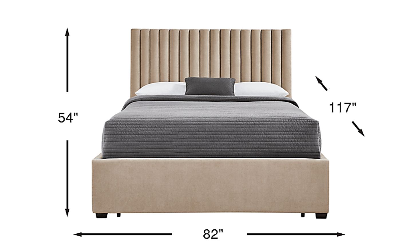 The lavish style and bold presence of the Belvedere bed sets up your sleep space as a cozy refuge unlike any other. The tall headboard features a row of reeded details that catch the light in soft beige. In contrast, the simple footboard and sturdy block legs of the bed accentuate the look without stealing the show. Hidden away inside the footboard is a drawer with space for extra linens and pillows. Upholstery: 100% polyester.