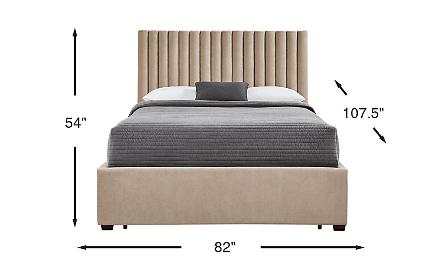 When measuring your bedroom, consider the bed's total footprint of 82"w x 107.5"d. The increased depth is due to the integrated storage drawers in the footboard. To ensure a functional and comfortable layout, we recommend leaving at least 30 inches of clearance around the sides and foot of the bed. This allows the drawers to extend fully and provides enough walking space to navigate the room without interference from nightstands or walls.