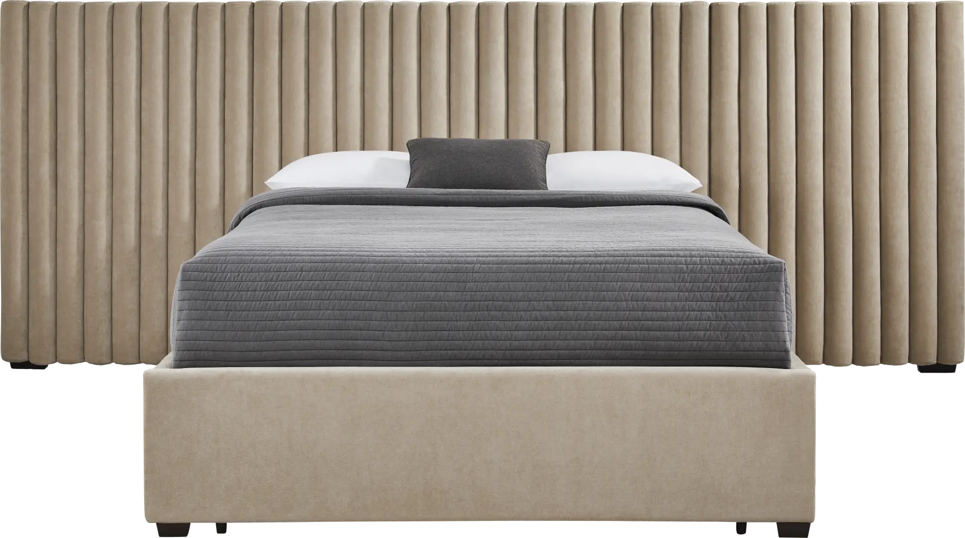 This bed is a versatile anchor for both contemporary and mid-century modern interiors. The sophisticated reeded texture on the oversized headboard adds a tactile, high-end feel, while the simple block legs provide a grounded, minimalist aesthetic. Its neutral beige palette allows it to serve as a calm backdrop for bold accents or a seamless part of a monochromatic, modern bedroom design.