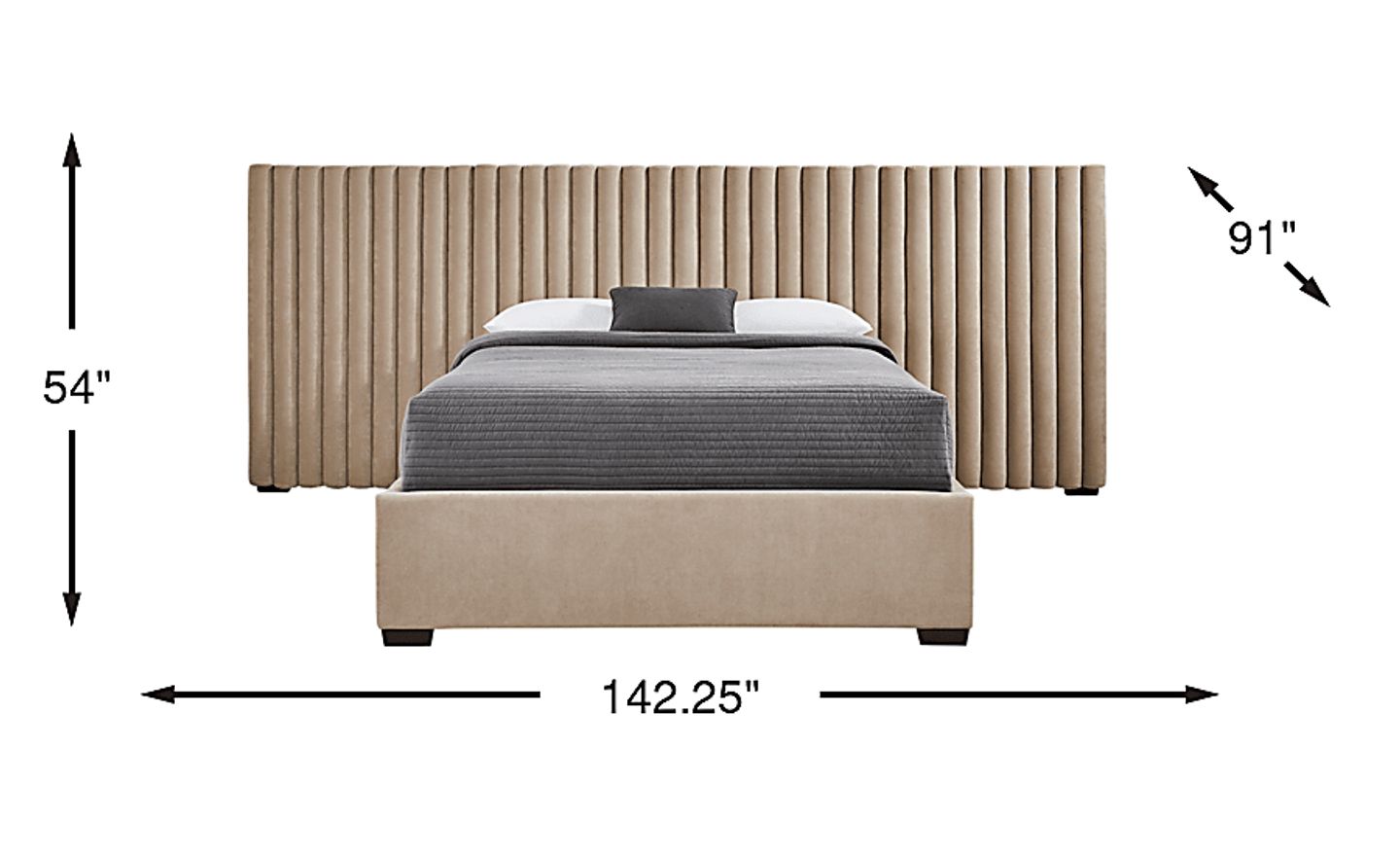 This bed is specifically designed for larger rooms that can accommodate its 139.75" width. Because the headboard panels extend significantly beyond the width of a standard queen mattress, we recommend measuring your primary wall to ensure the panels do not overlap with windows, light switches, or electrical outlets. At 90" deep, it also requires ample clearance at the foot of the bed for comfortable movement.