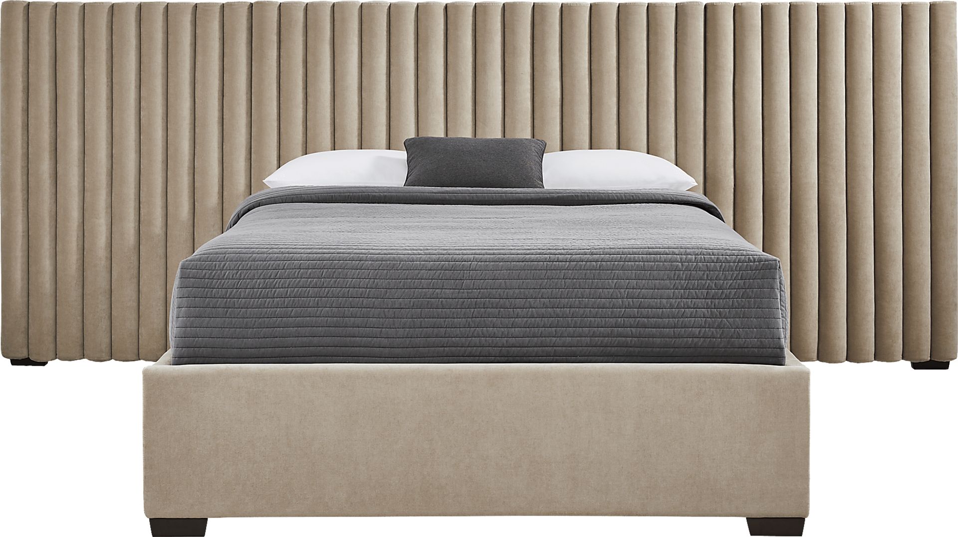 The lavish style and bold presence of the Belvedere wall bed sets up your sleep space as a cozy refuge unlike any other. Two wing panels extend the upholstered headboard to almost 3 times its original length, featuring reeded details in soft beige. In contrast, the simple footboard and sturdy block legs of the bed accentuate the look without stealing the show. Upholstery: 100% polyester.