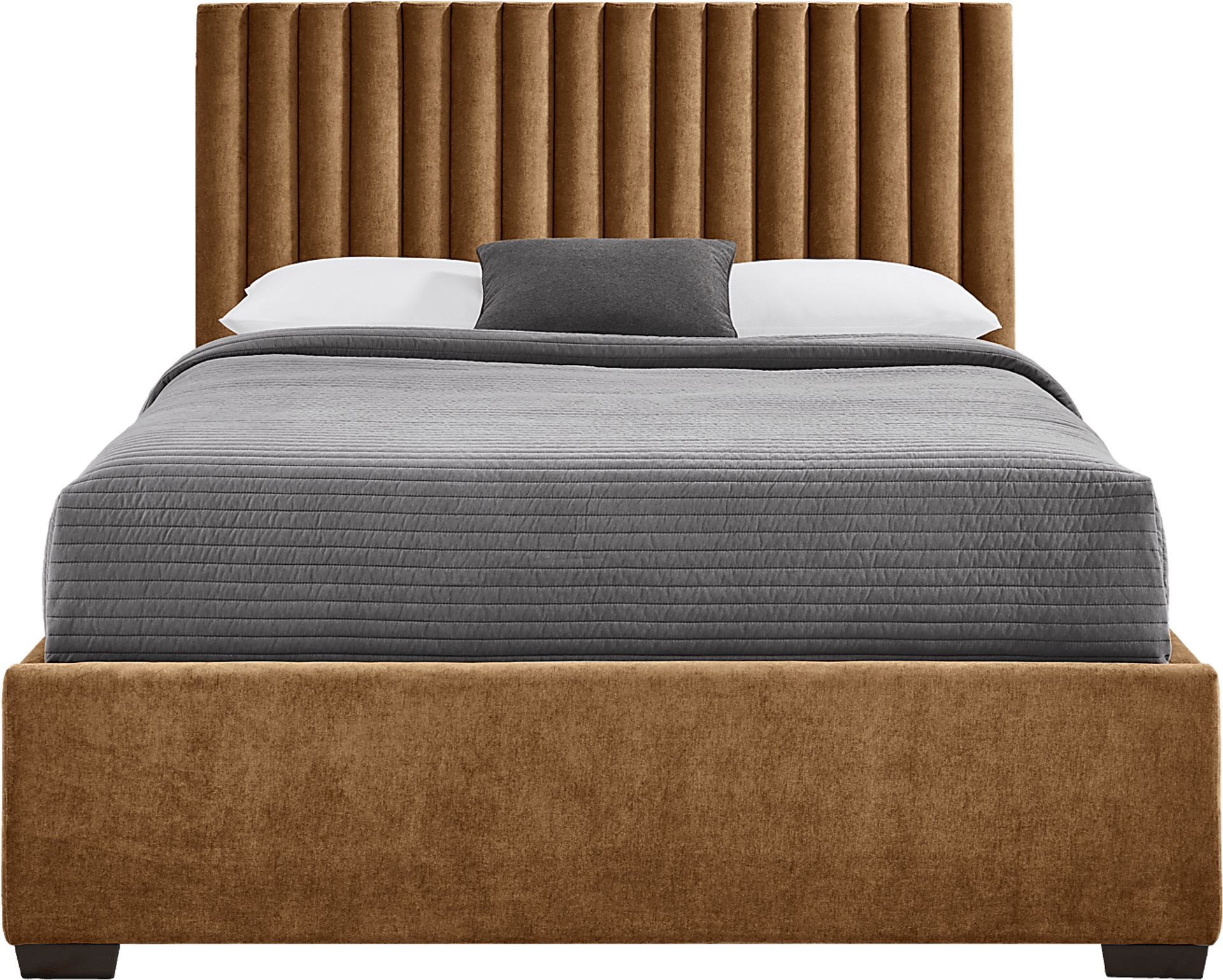 The lavish style and bold presence of the Belvedere bed sets up your sleep space as a cozy refuge unlike any other. The tall headboard features a row of reeded details that catch the light in soft cognac brown. In contrast, the simple footboard and sturdy block legs of the bed accentuate the look without stealing the show. Upholstery: 100% polyester.