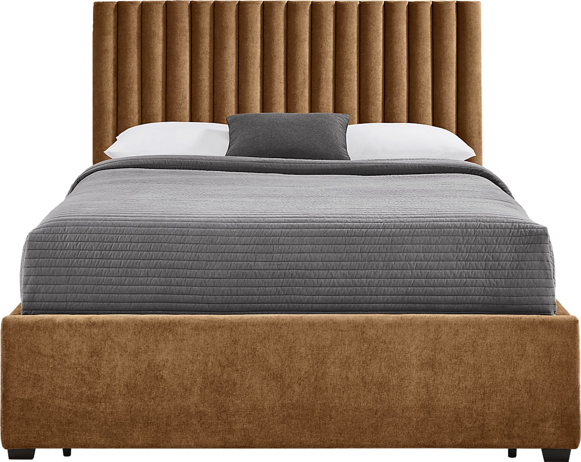 The lavish style and bold presence of the Belvedere bed sets up your sleep space as a cozy refuge unlike any other. The tall headboard features a row of reeded details that catch the light in soft cognac brown. In contrast, the simple footboard and sturdy block legs of the bed accentuate the look without stealing the show. Hidden away inside the footboard is a drawer with space for extra linens and pillows. Upholstery: 100% polyester.
