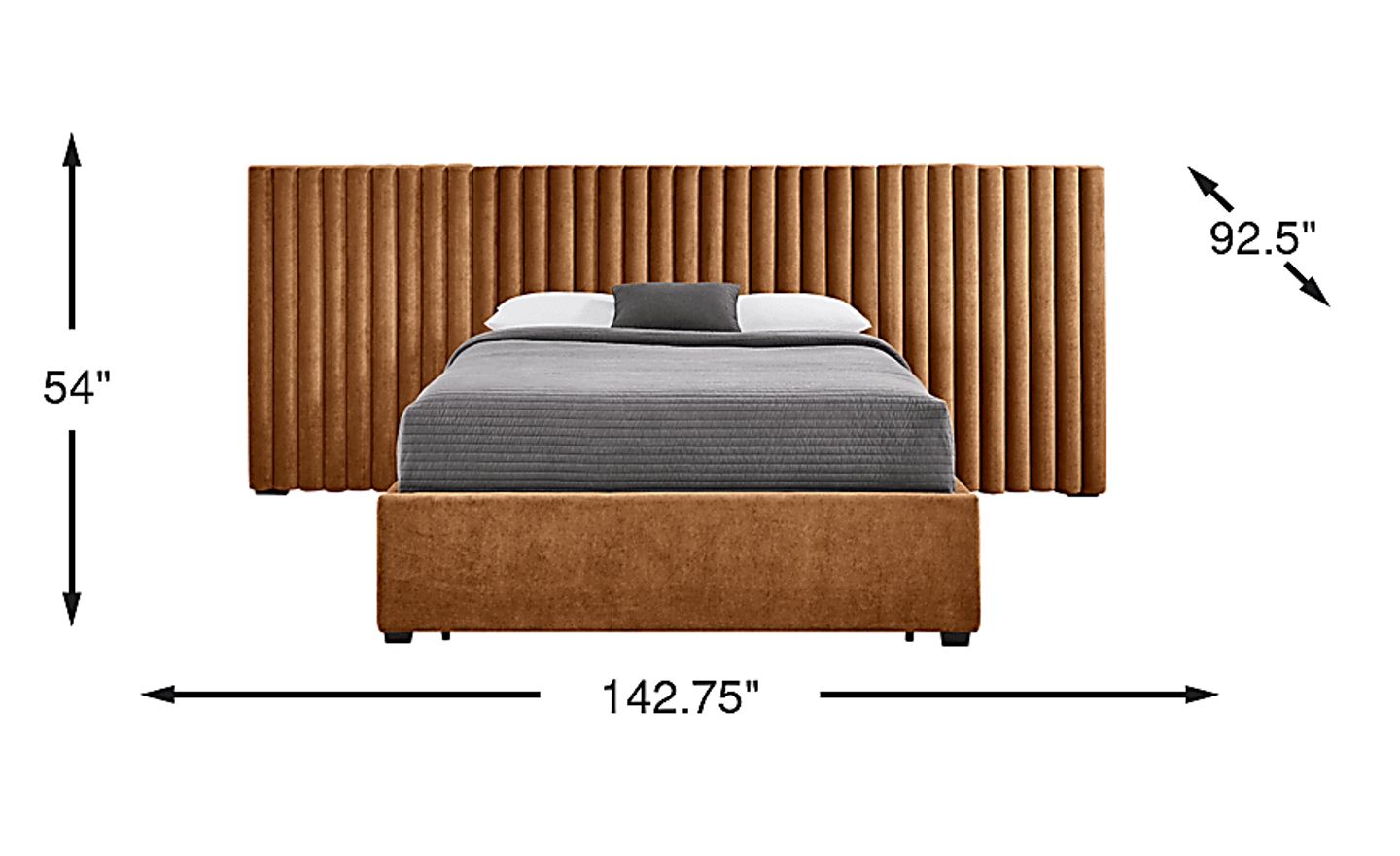This bed features an expansive headboard measuring 139.75 inches wide—nearly 12 feet across. The "wall" design utilizes extended wing panels that create a dramatic architectural backdrop, effectively tripling the width of a standard queen headboard. We recommend measuring your wall carefully to ensure it can accommodate this significant width while still allowing room for nightstands and comfortable walkways.