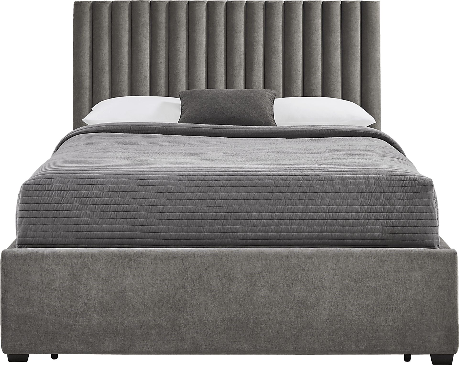The lavish style and bold presence of the Belvedere bed sets up your sleep space as a cozy refuge unlike any other. The tall headboard features a row of reeded details that catch the light in soft smoke gray. In contrast, the simple footboard and sturdy block legs of the bed accentuate the look without stealing the show. Hidden away inside the footboard is a drawer with space for extra linens and pillows. Upholstery: 100% polyester.