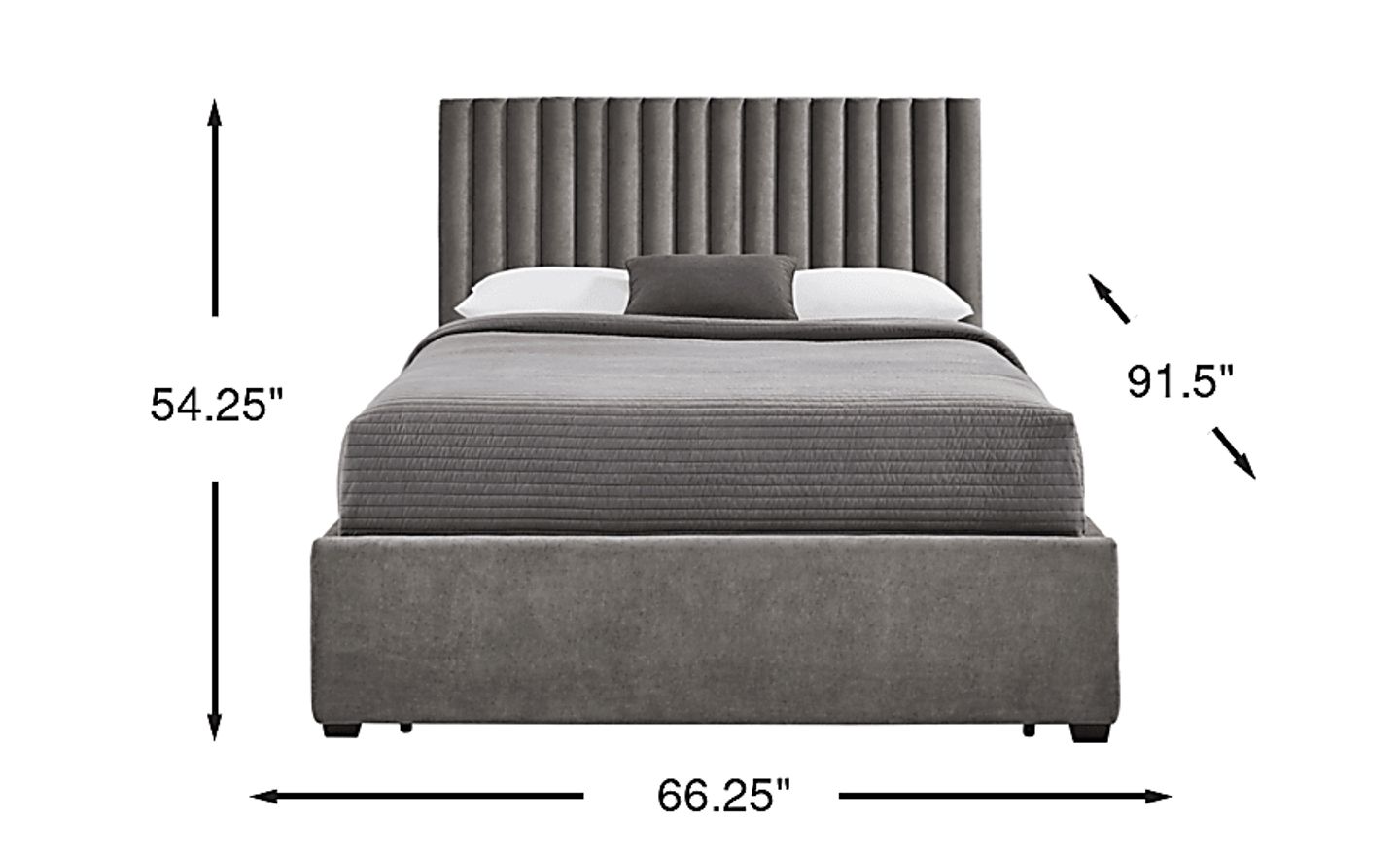 The headboard serves as a refined focal point, standing 54.25" tall with a distinctive reeded tufting style. This contemporary detail creates vertical texture that catches the light across the smoke gray fabric, while the padded upholstery offers a comfortable, supportive surface for sitting up in bed to read or watch television.