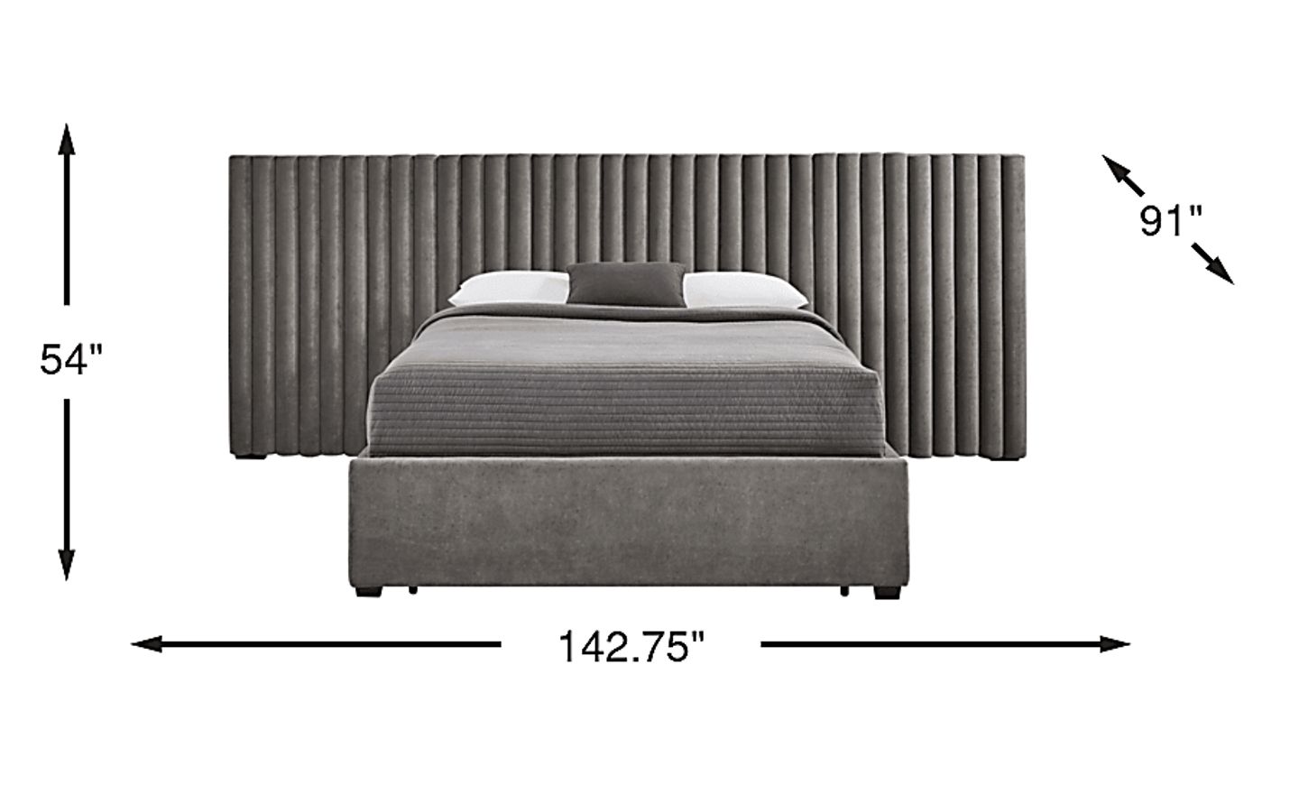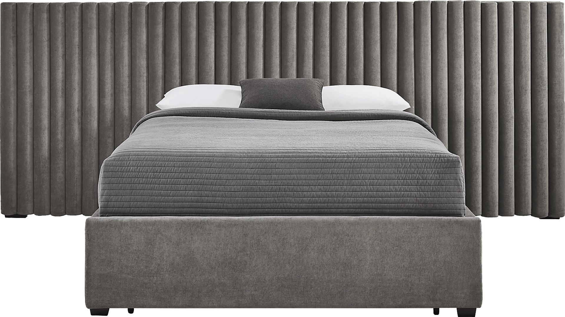The lavish style and bold presence of the Belvedere wall bed sets up your sleep space as a cozy refuge unlike any other. Two wing panels extend the upholstered headboard to almost 3 times its original length, featuring reeded details in soft smoke gray. In contrast, the simple footboard and sturdy block legs of the bed accentuate the look without stealing the show. Hidden away inside the footboard and sides are three drawers with space for extra linens and pillows. Upholstery: 100% polyester.