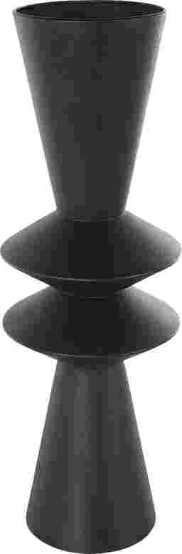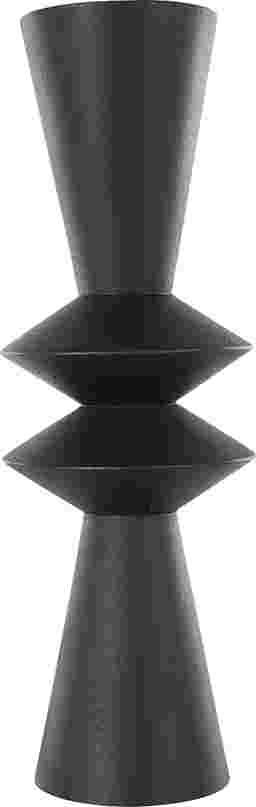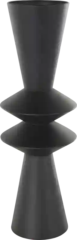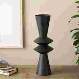 The bold, monochromatic matte black finish makes this vase a perfect vessel for high-contrast natural elements. We recommend styling it with tall, dried branches, eucalyptus stems, or pampas grass to create a sophisticated modern look. Its unique rounded shapes and angular structure also allow it to stand alone as a piece of sculptural art.