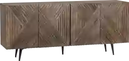 The Beneventoy brown sideboard crafted from mango wood exudes style and functionality with its 4-doors and 2 inner shelves. The design is eye-catching and uniquely showcases clean lines, an angular carved design, and a stunning golden-brown hue. The black metal legs elevate the modern aesthetic and add a sleek touch to its overall look. Customer assembly is required.