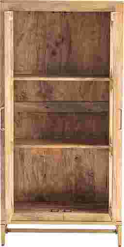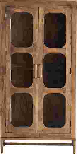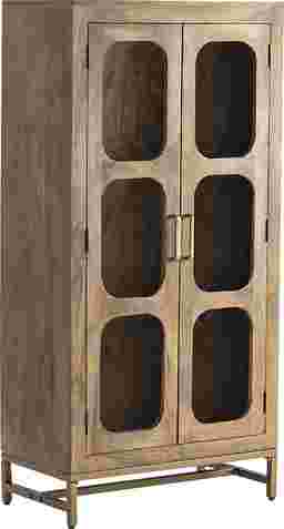 Filled with the character of a cozy home library, the Bengal cabinet offers a refined storage solution for organizing your space. Whether used for storing dinnerware, books, or decorative pieces, this transitional piece showcases a clean, tailored profile and a warm brown finish. Two doors with framed glass panels soften the silhouette and offer a peak into the contents of the cabinet. A gold finished metal base and matching door handles add a modern touch of contrast, grounding the piece with a hint of shine.