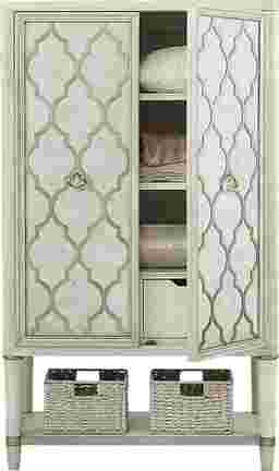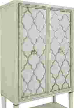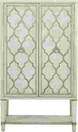An elegant and useful addition to any bedroom, the Bentley Hills door chest offers a stylish storage space for clothing, bedding and more. Crafted using wood solids with primavera and mapa burl veneers rendered in a light gray finish, this chic piece features a unique metal trellis design and custom coordinating hardware on each door front. Inside, adjustable shelving and two drawers offer versatile storage space.