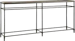 The Bentnail sofa console table infuses a transitional style with urban elements into the living room or den. A generously scaled 60 top is crafted from solid mango in a lightly sand-blasted, pickled finish. Six steel legs in a gunmetal finish add an industrial flair, while metal stretchers ensure stability. Perfect for use as an entryway table to hold decorative accents and keys, or to place behind a sofa to house reading materials and a lamp. Customer assembly is required.