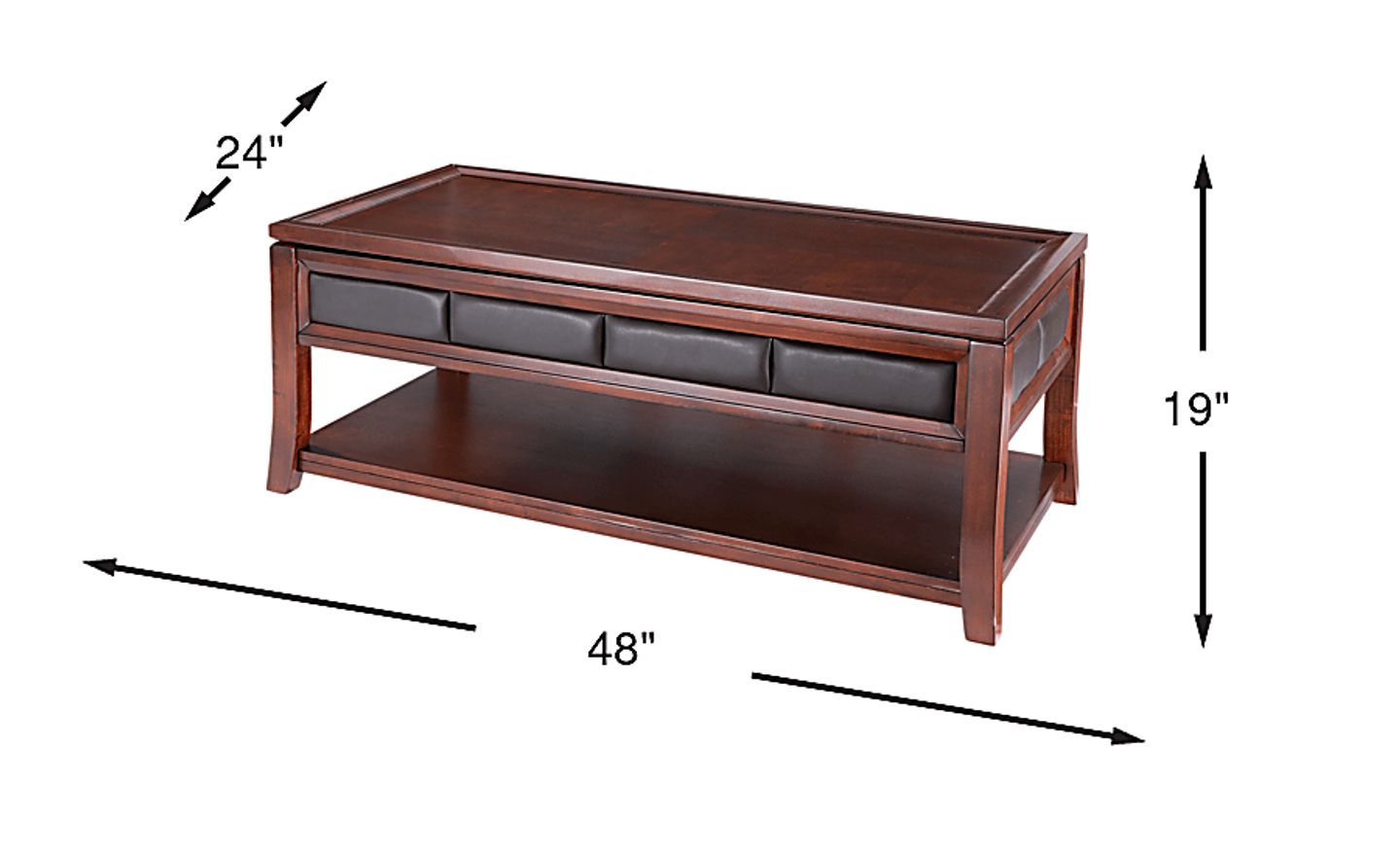 Perfect for today's busy family room, the Benton Square cocktail table is very versatile. It features a lift top that rises to reveal roomy storage with dividers to help organize small items like remotes, game controllers, magazines and more. Made of poplar solids and birch veneers with a merlot finish, the table is accented with chocolate colored Bicast leather. Customer assembly required