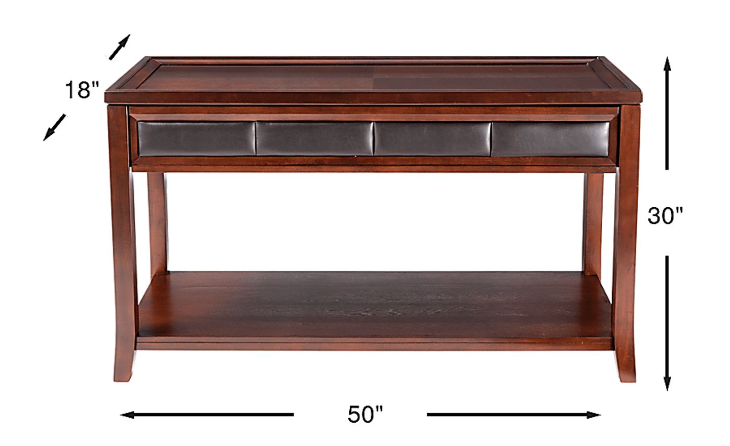 Why overwhelm your room when you don't have to? The Benton Square sofa table provides stylish media storage that's sized just right. The sofa table features a smooth surface for your flat screen TV, and for electronic components, you'll find cubbies concealed by a hinged fold down panel that's accented with chocolate color Bicast leather. Quality construction is achieved with poplar solids and birch veneers with a merlot finish.