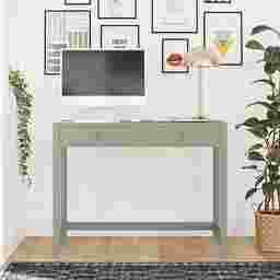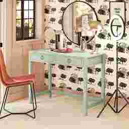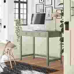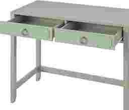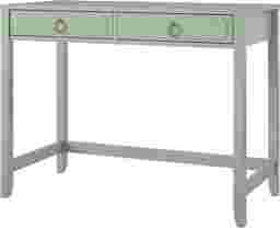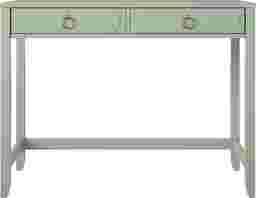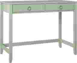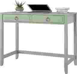 Study in elegant style with the Berenger desk. The mint finish on the painted MDF and real wood legs pairs easily with your existing decor and the ring pulls and decorative drawer front molding add a sophisticated look. The spacious desktop offers plenty of space for a laptop, side lamp, and other essentials. The two drawers feature durable metal slides and provide ample storage space for notebooks and writing utensils. Once assembled, the desk measures to be 40 W x 30.25 H x 19.69 D. Customer assembly required.