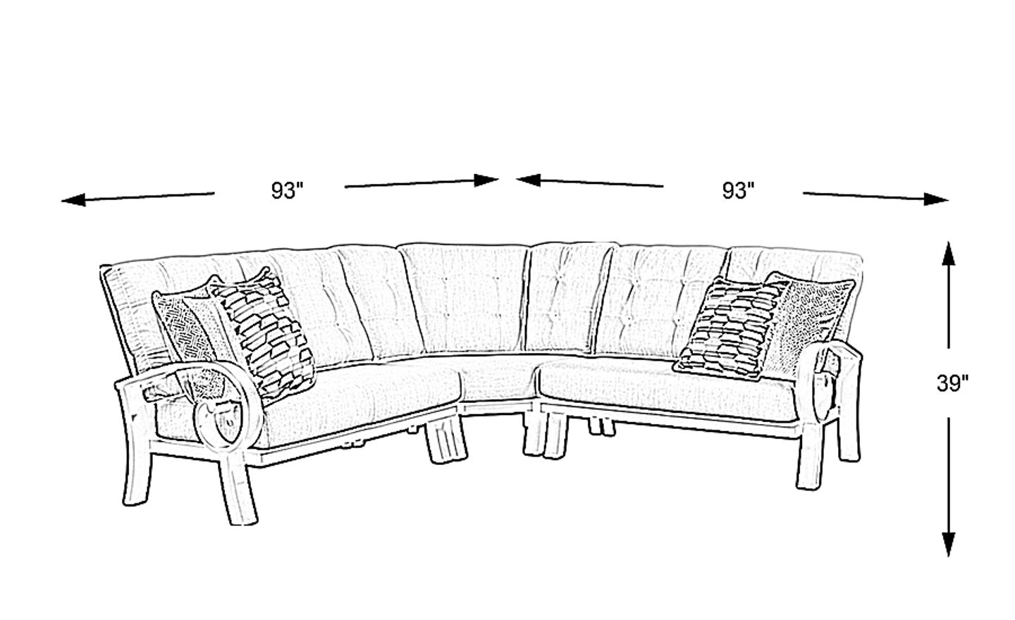 There's room for plenty of friends with the Bermuda Bay outdoor sectional. This cozy collection with graceful curled arms features slat back styling and is made with an aluminum frame in a rust resistant all-weather powder coat finish using a hand applied aged bronze finished UV protected top coat. Neutral parchment colored Sunbrella cushions resist fading and are mold and mildew resistant, creating long lasting and comfortable outdoor seating. Four designer style Sunbrella accent pillows and button tufting details on the back cushions add decorative flair. 100% Sunbrella fabric. To clean Sunbrella fabric cushions remove dirt and spray on cleaning solution (water and mild soap), then use a soft bristle brush or sponge. Allow cleaning solution to soak into fabric and rinse thoroughly until soap residue is removed. Air dry. Do not dry clean.