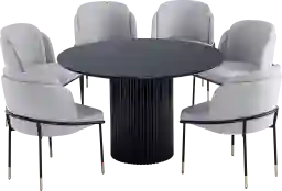This set is designed to accommodate six people comfortably, featuring a generous 59.5-inch diameter surface that provides ample space for place settings and serving dishes. The expansive round design and pedestal base are specifically engineered to maximize usable area, ensuring that every guest has plenty of elbow room during communal meals.