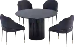 Elevate your dining experience with the Bermunda black and black 5 Pc dining set, a fusion of rugged aesthetics and refined functionality. Crafted for convivial gatherings, its expansive surface accommodates up to 4 chairs with ease, while the raw, textured allure of the wood grain adds a touch of urban sophistication. This table beckons as a centerpiece for communal moments, where the fusion of industrial design and timeless elegance sets the stage for unforgettable meals and shared stories. Customer assembly is required.