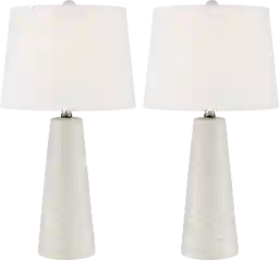 The Berryessa table lamp is a set of two that have an elegantly shaped ceramic body and textured chevron design. These can be added to any room to bring it to life with their glossy white color. Partial assembly may be required.