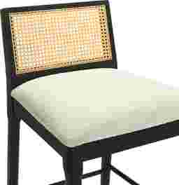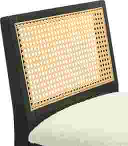 The woven rattan backrest is designed to offer a blend of breathable support and ergonomic comfort. By combining the natural flexibility of rattan with a plush, upholstered seat, this stool provides a comfortable seating solution for more than just a quick snack. The combination of textures—warm wood, natural rattan, and soft boucle—creates an inviting chair suitable for long conversations and homework sessions alike.