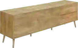 Make a statement in your living room, family room, or bedroom with the Berrywares brown console in a mid-century design with a light walnut laminate finish. This console boasts a retro style that is both fashionable and functional. The durably designed piece features solid wood legs with an easy to clean top for care-free maintenance. The two easy glide closed storage drawers and two storage cabinets with an adjustable shelf each helps to keep your media essentials organized and out of sight. The push latch mechanism adds a modern touch, while the two cable management holes in the back keeps cords tidy. Easy to assemble with illustrated instructions and all hardware included. Customer assembly is required.