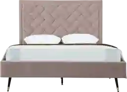 The Bevra blush queen bed anchors your bedroom in glam, mid-century-inspired style. It's built with an engineered wood frame and features understated side rails and footboard for a clean-lined silhouette. The headboard is upholstered in a luxurious velvet that features chevron style weave stitching. Plus, it's filled with foam for some extra cushion behind your head. Angled black iron legs with gold tips support the bed with a retro aesthetic. This bed arrives with slats and a center support leg, so you don't have to use a box spring with your choice of mattress. Customer assembly is required.