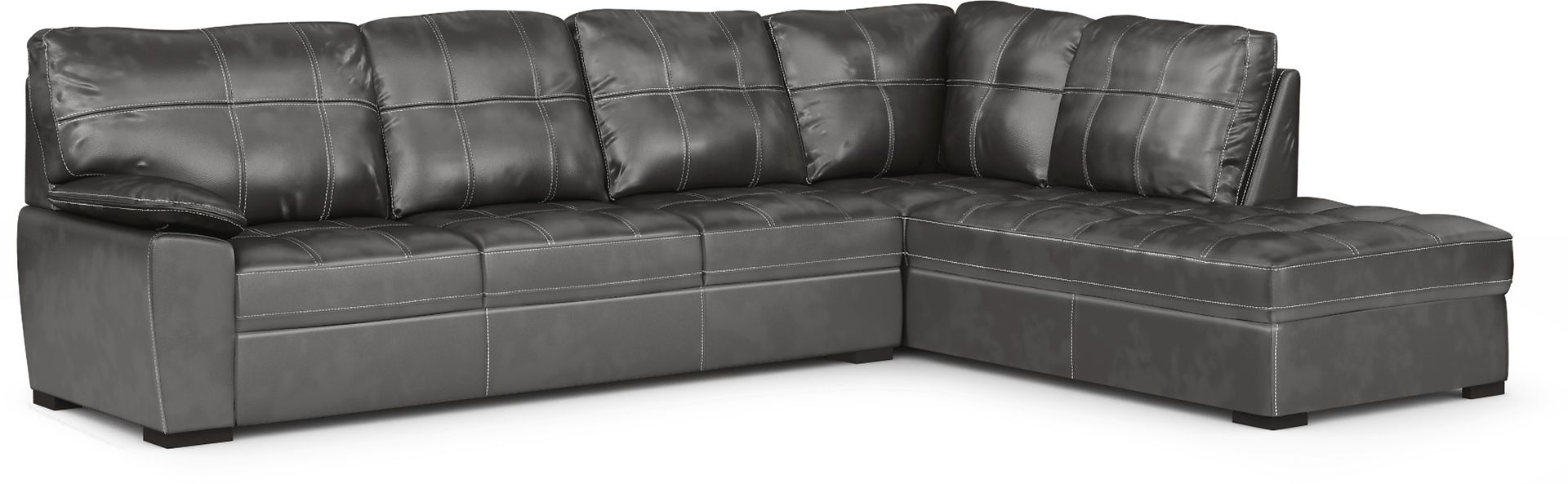 Contemporary seating accommodating up to five adults, the Bexley Square sectional is equal parts comfortable and stylish. Upholstered in slate gray innovative polyester blend fabric, this sectional features coordinating top stitching and subtle tufting detailing on the attached seat and back cushions, plus a luxurious pillowtop arm. 100% Polyester.