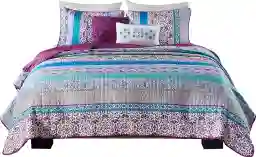 Update your bedroom with the chic boho flair of the Bezzy quilt set. Featuring several globally inspired prints, this quilt flaunts bold and bright colors with a solid purple reverse to create a gorgeous boho look. The 2 matching shams mirror the design of the quilt, while 2 decorative pillows add the finishing touches and bring the reversible quilt set together. Pre-washed cotton filling provides extra durability and comfort. Customer assembly is required.