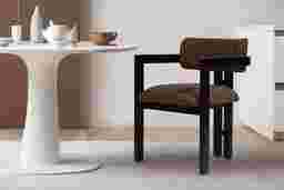Yes. While many dining chairs prioritize style over comfort, this model features an armchair silhouette with a subtly curved backrest and a generously cushioned seat. The track arms provide added support, allowing guests to linger comfortably at the table long after the meal has ended.