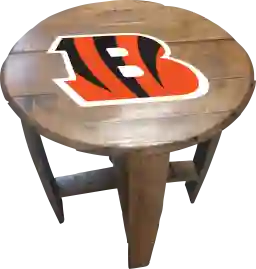 Liven up your living room or fan cave with this officially licensed Cincinnati Bengals custom made oak barrel end table. Made from an authentic Kentucky oak charred whiskey barrel, this rustic-style table is one of a kind and looks great in any room. The team logo is applied by injecting UV resistant ink into the oak and then sealing. The table measures 21 Inches in diameter and is 24 inches high. This product is officially licensed by the NFL and is made in the USA. Customer assembly required.