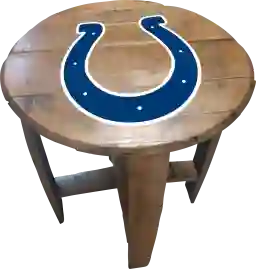 Liven up your living room or fan cave with this officially licensed Indianapolis Colts custom made oak barrel end table. Made from an authentic Kentucky oak charred whiskey barrel, this rustic-style table is one of a kind and looks great in any room. The team logo is applied by injecting UV resistant ink into the oak and then sealing. The table measures 21 Inches in diameter and is 24 inches high. This product is officially licensed by the NFL and is made in the USA. Customer assembly required.