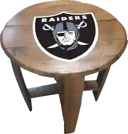 Liven up your living room or fan cave with this officially licensed Las Vegas Raiders custom made oak barrel end table. Made from an authentic Kentucky oak charred whiskey barrel, this rustic-style table is one of a kind and looks great in any room. The team logo is applied by injecting UV resistant ink into the oak and then sealing. The table measures 21 Inches in diameter and is 24 inches high. This product is officially licensed by the NFL and is made in the USA. Customer assembly required.