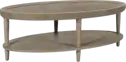 Experience sophistication with the Birmensdorf beige cocktail table. The oval shape not only adds a touch of elegance but also ensures smooth lines and flow in your living space. Coupled with a distinctive raised edge, it's designed to keep items secure and prevent them from falling off. This classic farmhouse piece, in a reclaimed finish and elegant turned legs, seamlessly marries style and function. It features fixed shelving and adjustable levelers for optimum utility and tools included. Add a touch of refined curvature to your decor. Customer assembly is required.