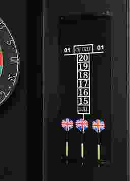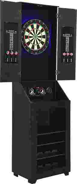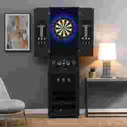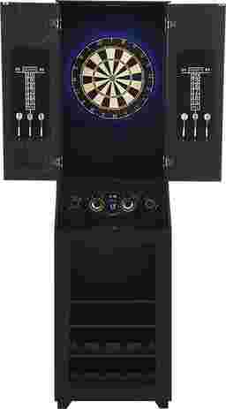 This cabinet is a comprehensive entertainment center. It features cabinet doors that open to reveal two scoreboards and a dartboard illuminated by integrated LED lighting for better visibility during play. Additionally, it includes built-in Bluetooth speakers, allowing you to stream music or game audio directly from the unit to enhance the social atmosphere of your space.