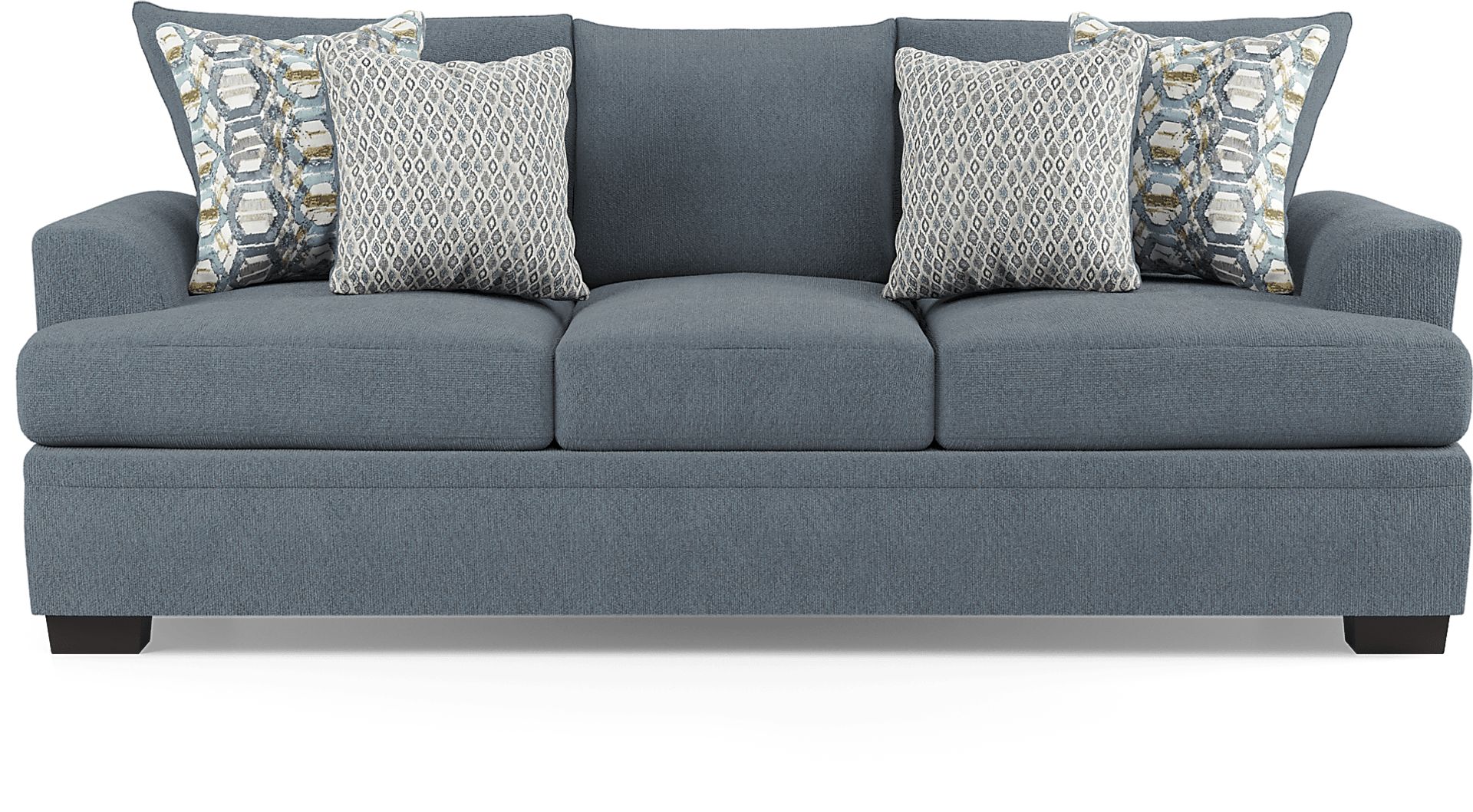 A contemporary silhouette, cozy fabric and queen size mattress make the Blair Park sleeper an excellent choice for your living space. The sleeper sofa is covered in soft chenille upholstery in a bluestone color. Seating for three is enhanced by decorative jacquard accent pillows and reversible seat cushions. When it's time for overnight guests, the queen size Nature's Bed mattress, with gel foam comfort, offers an easy solution. Block legs in a rich brown finish provide stylish support. 100% Polyester