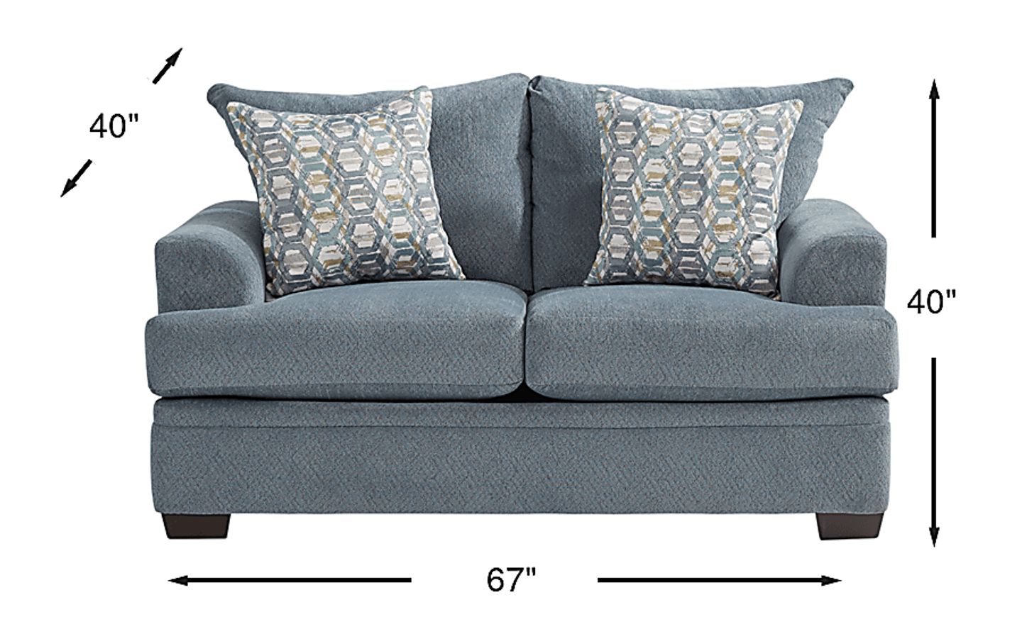 The Blair Park loveseat provides a cozy place to curl up solo or welcome a friend for a chat. Padded arms, two back pillows and jacquard accent pillows offer just the right support while deep seating and soft chenille fabric, with a cozy feel, adds to the high level of comfort. Loose T-cushion seats are reversible to extend the life of the loveseat. The bluestone color and block legs offer a casual contemporary aesthetic. 100% Polyester
