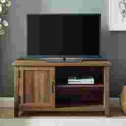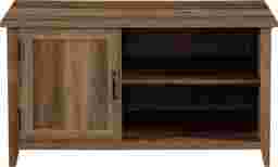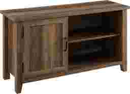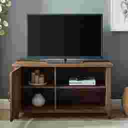The feel of a breezy life in the countryside awaits you when you debut this coastal farmhouse Blazyk TV stand in your living room or den. A single grooved door accented by exposed black hinges brings it back to its farmhouse roots with a modern twist and its simple silhouette imbues a sense of easy coastal living. Two adjustable shelves offer refuge to your movie night or day-to-day essentials with a seamless blend of open and closed storage. Cord management ports help discreetly display your media components atop the customizable shelving so your next watch party or family get-together around the TV can be as accessible and effortless as it is memorable. Customer assembly is required.