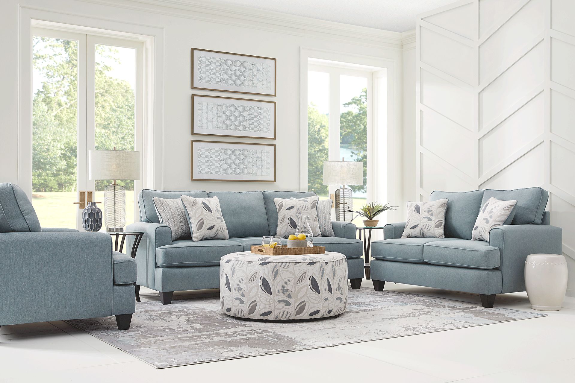 Furnish your living room with the classic looks of the Blooming Grove collection. Upholstered with an attractive, easy-to-clean fabric in a stunning aqua color, this stylish room is sure to please. Welted seams on the on the cushions and arms of each piece make for a tailored look. Pyramid legs in a black finish provide a stylish contrast to this collection. The included sofa and loveseat provide comfortable seating that can be arranged to your liking. Upholstery: 100% Polypropylene. Cleaning Instructions: Use water based cleaning agents or foam.