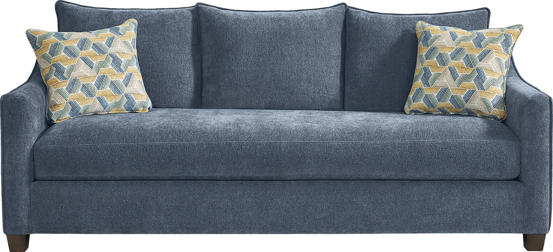 With the calm energy and relaxing vibe of a breath of fresh air, the Bloomington sofa has the makings of an all-time classic updated with a twist of modern flair. Upholstered in soft chenille fabric, this piece features a single, bench-style seat cushion with loose back cushions and sloped arms accented by welted outer seams. Accent pillows feature an eclectic medley of rich tones that make the denim color of the sofa pop with excitement. Upholstery: 100% Polyester.