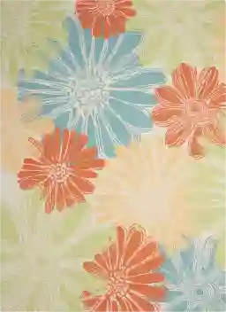 Add some excitement to any surrounding with the magnificent Bloomwood indoor/outdoor rug. A floral pattern in vivid colors make this a truly eye-catching rug. This versatile rug is beautiful to look at, soft to walk on, and easy to clean with just a hose. A delightful whimsical design that's perfect at home indoors or out, this rug features golden yellow, persimmon, coffee and ivory petals covering a lime green ground with floral beauty. It's artistic sketch effect turns Gerbera daisies into a bold, brilliant color statement.