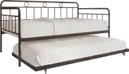 Featuring a sleek metal frame and a sturdy wooden slat base, this twin size Blossomotors daybed promises to provide a comfortable and restful sleep experience. With its smooth roll-out trundle bed, there's no need to worry about accommodating extra guests, as you'll have a convenient sleeping solution at your fingertips. The curved design and metal guardrails enhance the safety of the daybed, ensuring that your mattress, sold separately, stays in place throughout the night. The wooden slats are designed to allow air to circulate freely beneath your mattress, keeping it fresh and extending its lifespan. Ideal for those with limited space, this multi-functional daybed is the perfect choice for those who want to host guests in comfort and style. The included slat kit eliminates the need for a box spring. This exceptional metal daybed is the perfect choice for anyone looking to transform their sleeping space. Customer assembly is required.