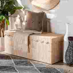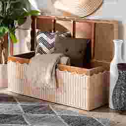 The rustic style and dynamic versatility of the Blossomtales brown storage bench combine to uplift your home. This bohemian piece is handcrafted from sustainably sourced natural rattan. Its lift-top opens to reveal a spacious storage compartment perfect for organizing and decluttering busy areas of your home. The Blossomtales will arrive fully assembled and features scalloped detailing for rich geometric allure that highlights the intricate craftsmanship of the piece. Ideal for any living room, entryway, or other shared space, the Blossomtales is sure to uplift any existing layout.