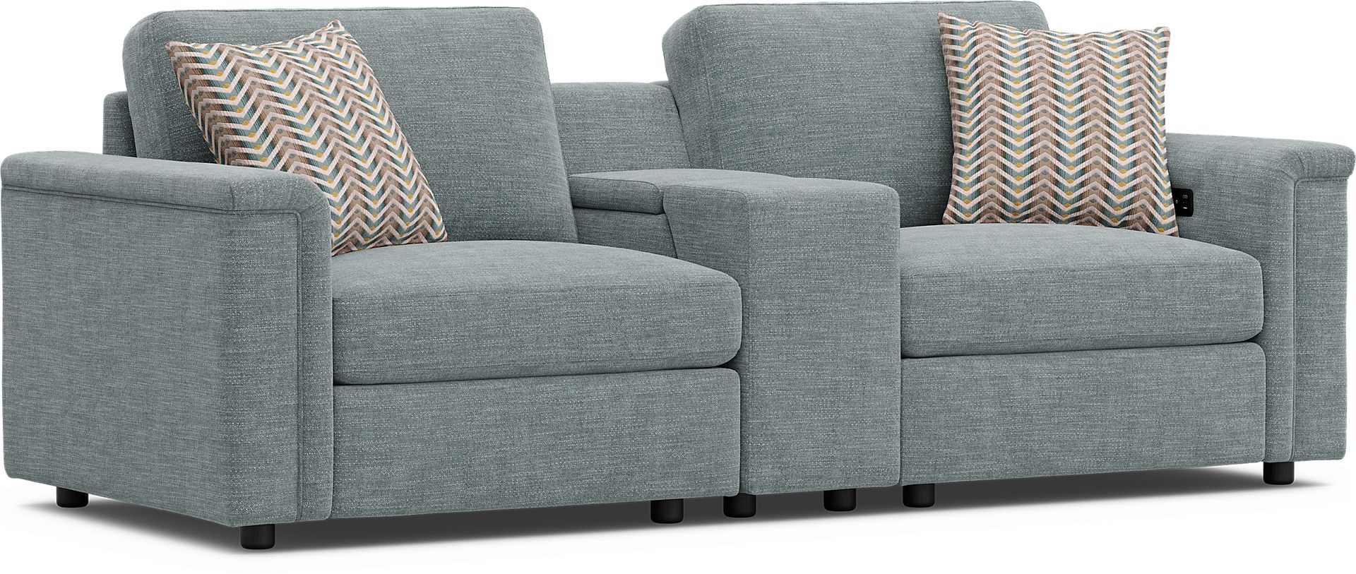The world quiets... life's rhythms slow... serenity washes over you as you gently relax into the Tempo Modular collection, its effortless luxury flowing from the unity of form and function. Transitional style defines this piece, its comfortably understated seats upholstered in blue chenille and highlighted with unique inverted waterfall track arms. Two media seats conceal bluetooth-enabled speakers, while the console features a subwoofer. Each speaker syncs with one another and your TV or phone, providing unbelievable surround sound. Media control panels set into both consoles and the arm of each media seat offer USB-A and USB-C charging as well. And, with easy-to-use connectors, this modular seating solution can be rearranged to fit your changing needs and tastes. Includes LAF media chair, media console and RAF media chair. Upholstery: 100% Polyester.