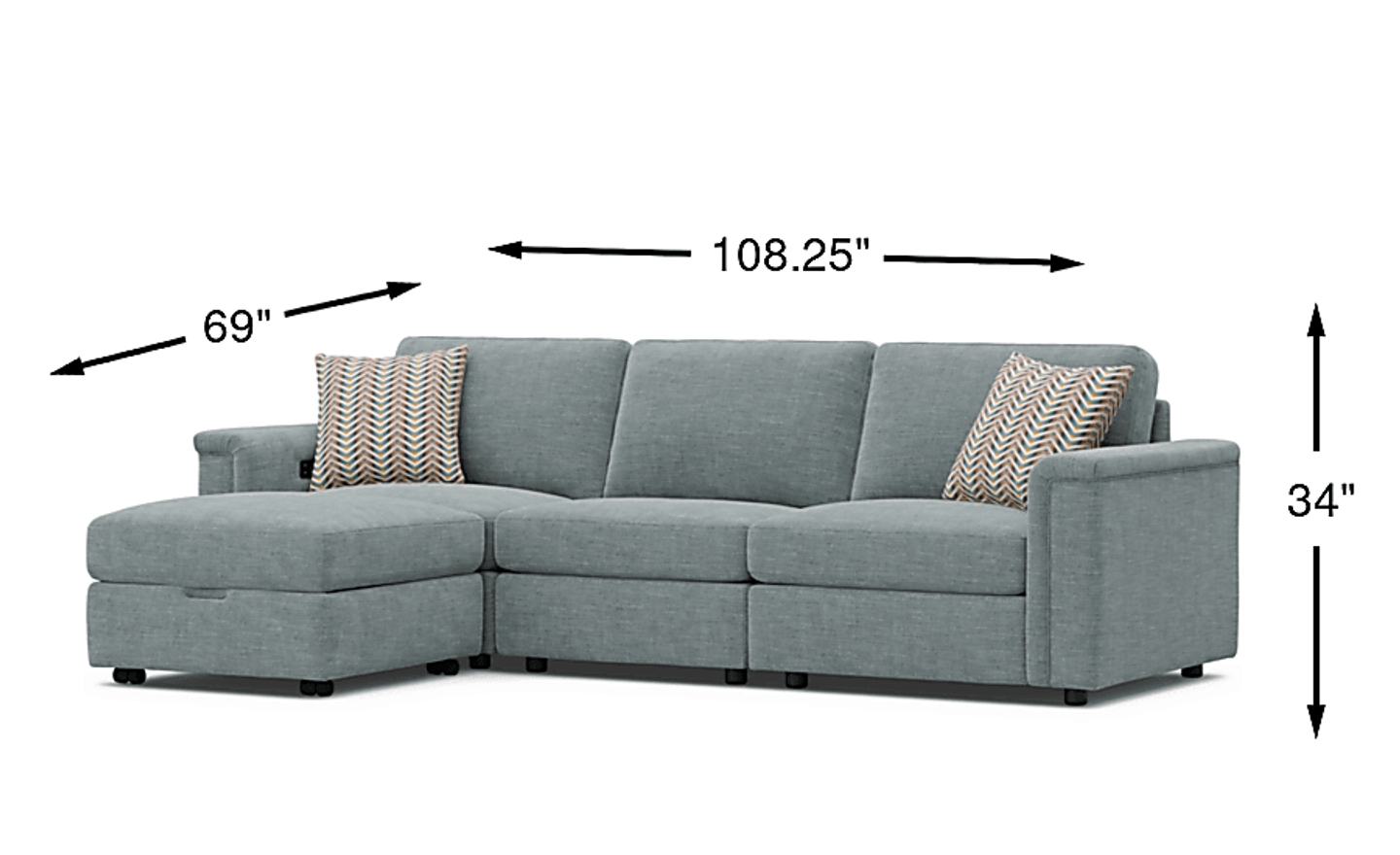 The world quiets... life's rhythms slow... serenity washes over you as you gently relax into the Tempo Modular collection, its effortless luxury flowing from the unity of form and function. Transitional style defines this piece, its comfortably understated seats upholstered in blue chenille and highlighted with unique inverted waterfall track arms. Two media seats conceal bluetooth-enabled speakers, syncing with one another and your TV or phone to provide unbelievable surround sound. Media control panels set into the arm of each media seat offer USB-A and USB-C charging as well. The storage ottoman provides extra space for blankets and pillows. And, with easy-to-use connectors, this modular seating solution can be rearranged to fit your changing needs and tastes. Includes LAF media chair, armless chair, RAF media chair and storage ottoman. Upholstery: 100% Polyester. Small accent pillow not included.