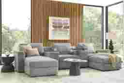 The world quiets... life's rhythms slow... serenity washes over you as you gently relax into the Tempo Modular collection, its effortless luxury flowing from the unity of form and function. Transitional style defines this piece, its comfortably understated seats upholstered in blue chenille and highlighted with unique inverted waterfall track arms. The included consoles feature swivel tables, hidden storage and USB-A and USB-C charging ports for ultimate convenience. The storage ottoman provides extra space for blankets and pillows. And, with easy-to-use connectors, this modular seating solution can be rearranged to fit your changing needs and tastes. Includes LAF chair, 2 consoles, armless chair, RAF chair and storage ottoman. Upholstery: 100% Polyester. Small accent pillow not included.