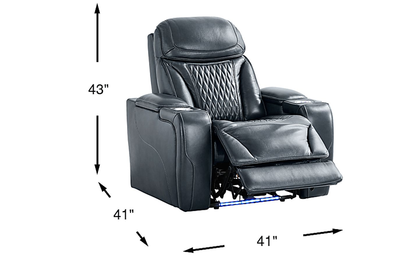 Experience the latest in recliner technology with the captivating, powerful presence and pure indulgence of the Recliner To Go from Sound Tech by Shaq as it transforms every moment into an experience of total immersion and irresistible comfort. Sumptuous blue leather where the body touches is accented with top-stitched designs. An array of full-range speakers in the arms and a subwoofer inside the seat base envelop you in crystal clear bluetooth-enabled surround-sound audio while responsive vibration puts you right in the middle of the action for a full-body sensory experience. Advanced audio controls hidden in the arm make it easy to adjust bass, treble, and vibration to create your perfect experience. Triple power reclining offers adjustable lumbar support, headrest and footrest as well as a zero gravity mechanism and air massage. USB ports are on the motion controls around the lighted cupholder, and base rail theater lighting offers a classy final touch. Upholstery: top grain leather where the body touches with polyurethane sides and back.