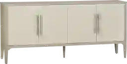 The Bluewell beige sideboard combines refined design with premium materials for a stylish and functional addition to your space. Made from durable rubberwood and white oak veneer, its textured raffia door panels are finished with a water-based coating in soft off-white and cream tones. Featuring four doors with European hinges and sleek metal handles, it opens to reveal two adjustable shelves with shelf pins for tailored storage. Cord management holes, floor levelers, and sturdy wooden legs complete its versatile design.