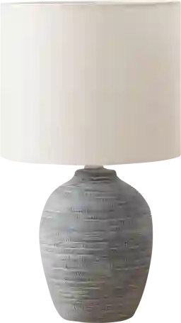 This lamp features a contemporary gray base with a textured finish. Unlike high-gloss ceramic or polished metal bases, this textured surface is highly practical for high-traffic areas as it naturally resists showing fingerprints and smudges. To maintain its appearance, we recommend simply dusting the base with a soft, dry cloth.