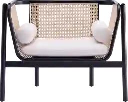 Surround yourself in chic modern luxury, with the Bodenhamer black accent chair. A durable and sleek solid wood frame supports the plush seat and side cushions, offering comfort and stylish versatility. Authentic wood rattan along the back and sides completes the piece, with a look made for any home's decor style.